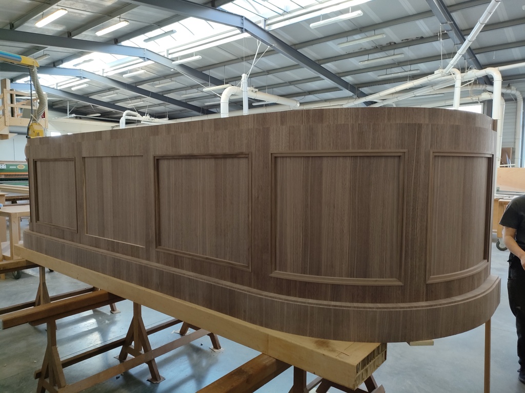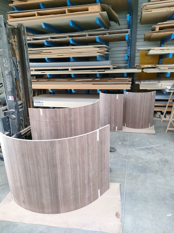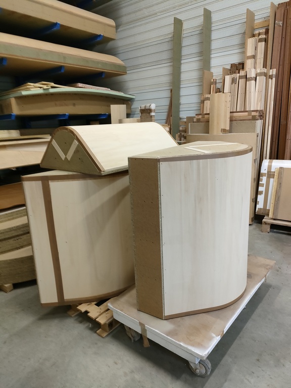 Fabrication de deux comptoirs de réception aux extrémités cintrées. |
