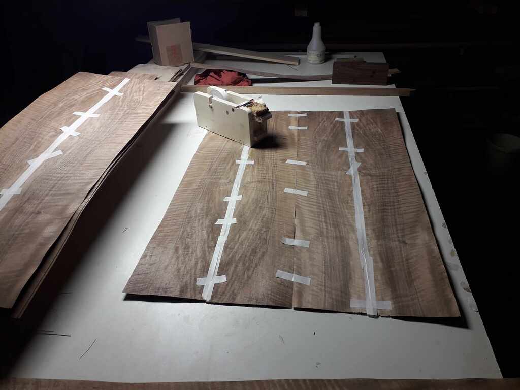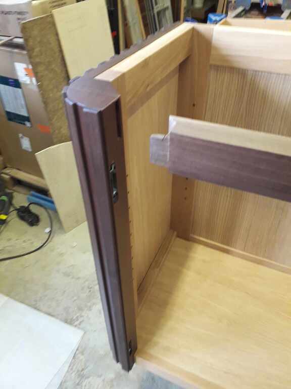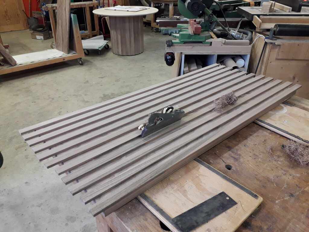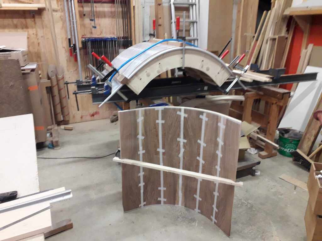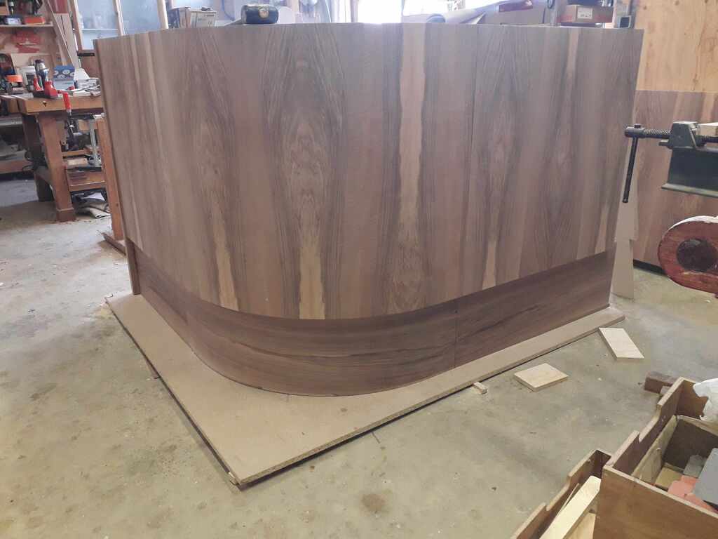 ossature buffet chêne massif panneau plan :latté 19 mm panneau courbe : CP cintrable placage noyer 7dixièeme |