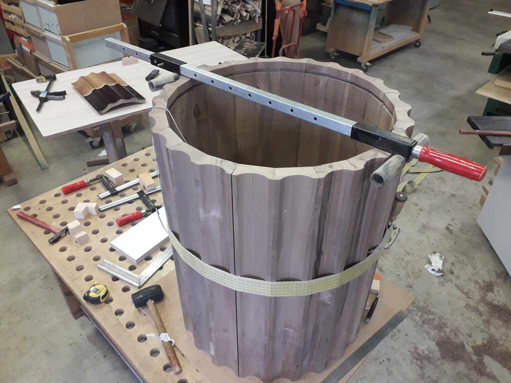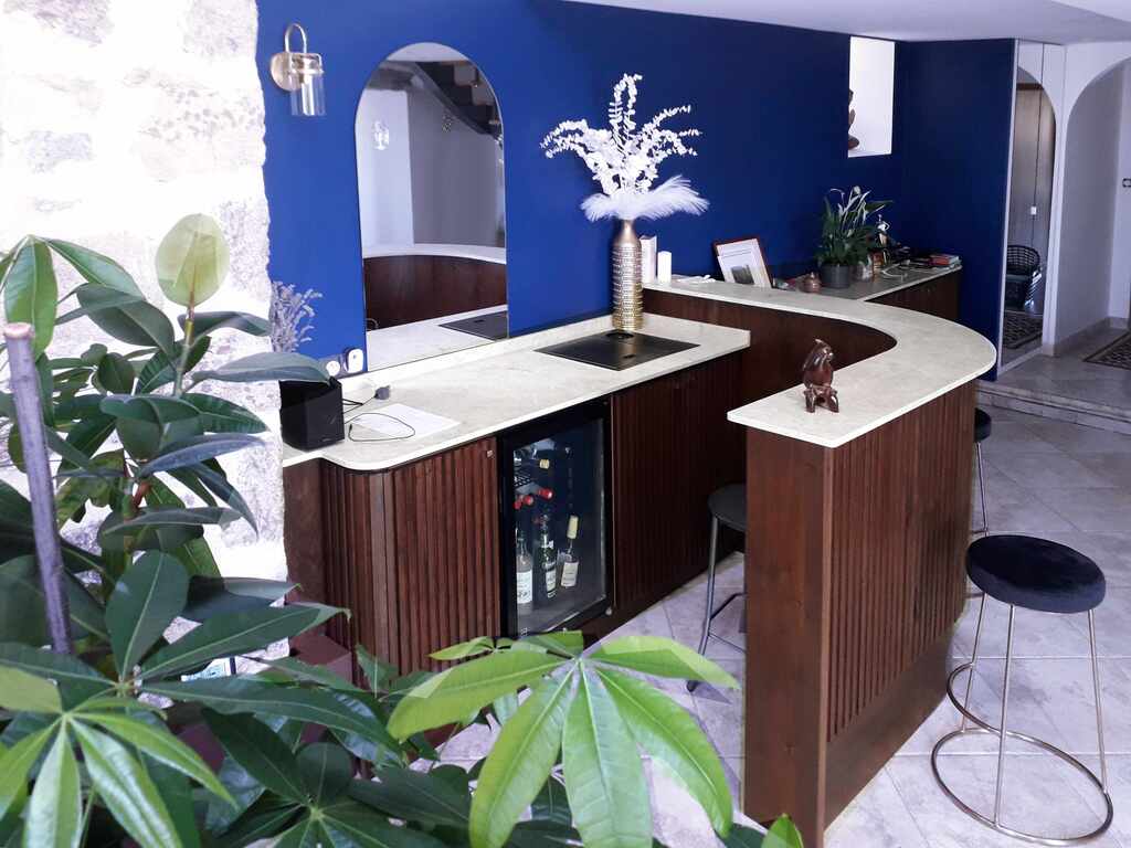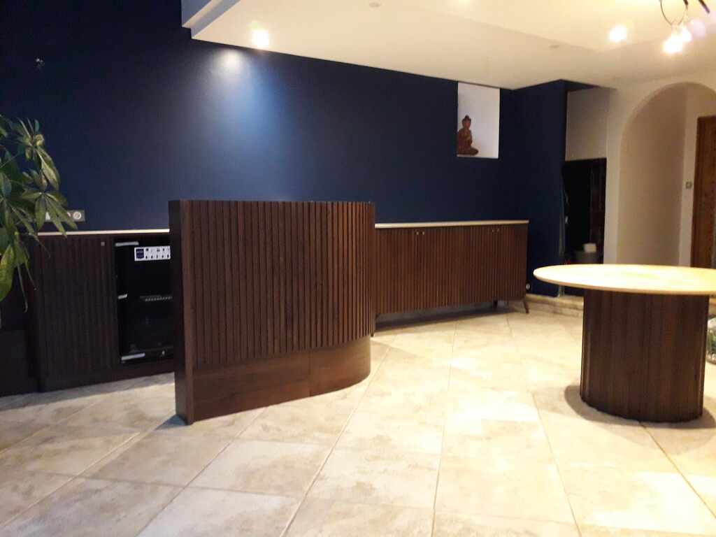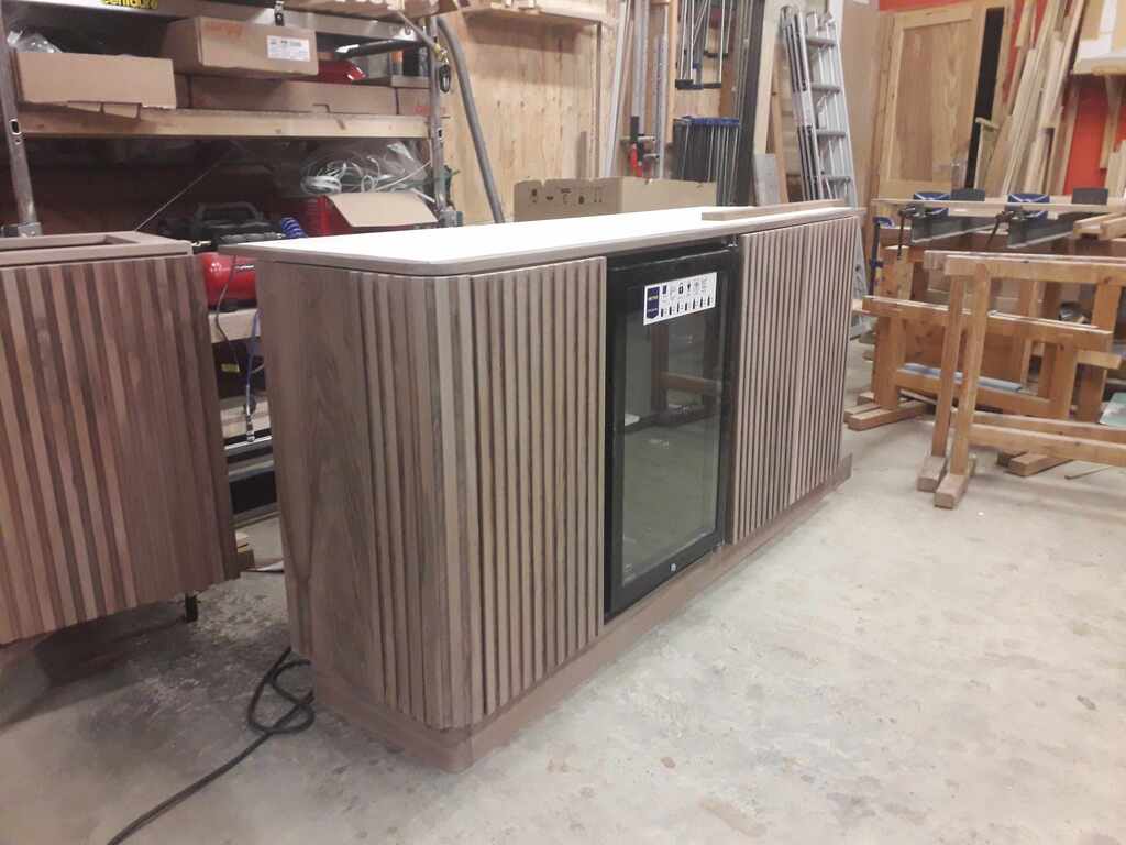 réalisation d'un piètement de table en fut à 24 pans. réalisation d'un buffet 4 portes plus tiroirs interieur réalisation d'un bar semi circulaire et d'un aménagement derrière bar |
