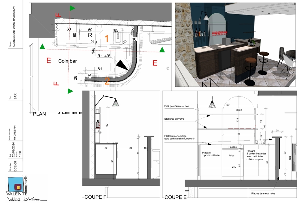 Mme Emmanuelle Valente architecte d’intérieur me sollicite pour un projet d'agencement de séjour pour son client. La conception globale du projet étant déjà définit mon intervention intervient sur la conception technique et mon interprétation de détail esthétique. Afin de répondre au mieux au besoin du client et de pouvoir valider le projet dans ses détails je réalise une maquette prototype d'un angle du buffet. Des échantillons de finitions sont également présentés. Après validation la fabrication est lancée. Pour les plateaux en granit du bar de la table et du buffet, j'ai accompagner l'architecte et le client chez mon prestataire de découpe de pierre. Ma prestation c'est poursuivie par l'agencement sous escalier, et un meuble télé devrait être réalisé prochainement pour compléter l’ensemble de l'agencement. |
