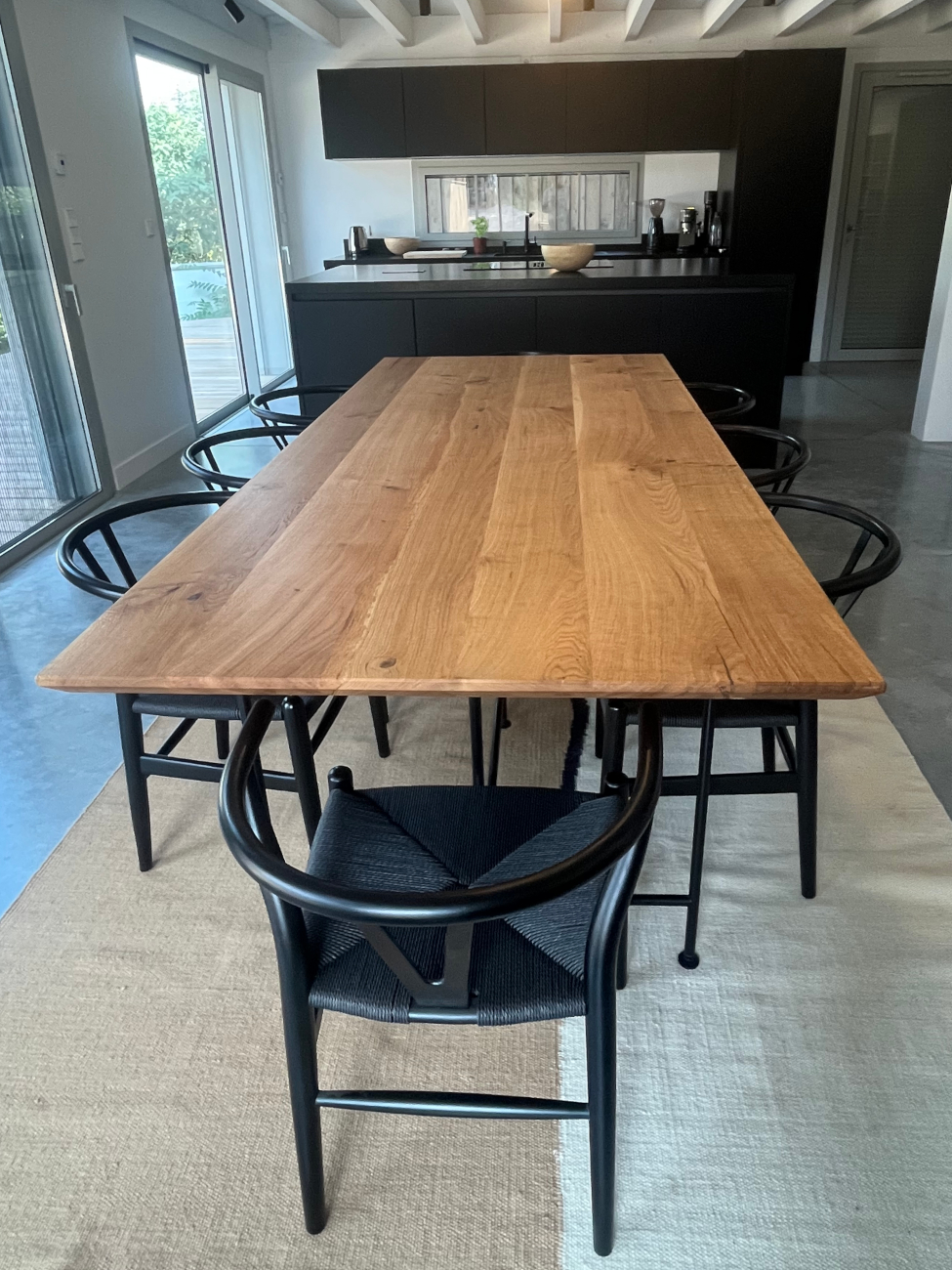 Table chêne massif plateau biseauté et pieds métalliques noirs