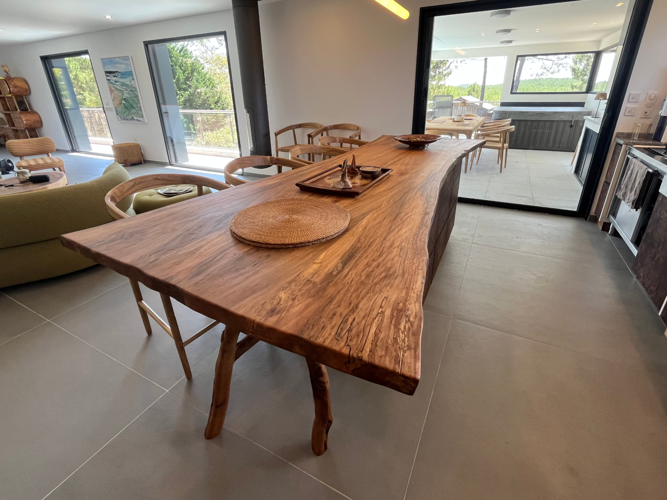 Transformation ilot central en table platane massif et façades en loupe de noyer d’Amérique